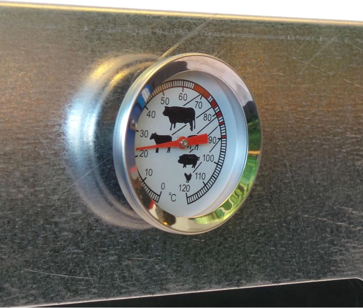 – De oven is voorzien van een professionele thermometer (0-120°C) die aangeeft wat de ideale temperatuur is voor verschillende vleeswaren.