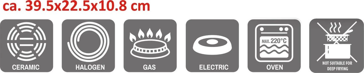 Met een afmeting van 39,5 x 22,5 x 10,8 cm en een inhoud van 5,5 liter bereid je gemakkelijk grote porties. Zo zet je met deze braadpan enorm diverse maaltijden neer voor het hele gezin. De mogelijkheden zijn eindeloos! De pan is geschikt voor een keramische-, halogeen- en inductiekookplaat. Ook kan hij op gas gebruikt worden, of in de oven op maximaal 220 graden.