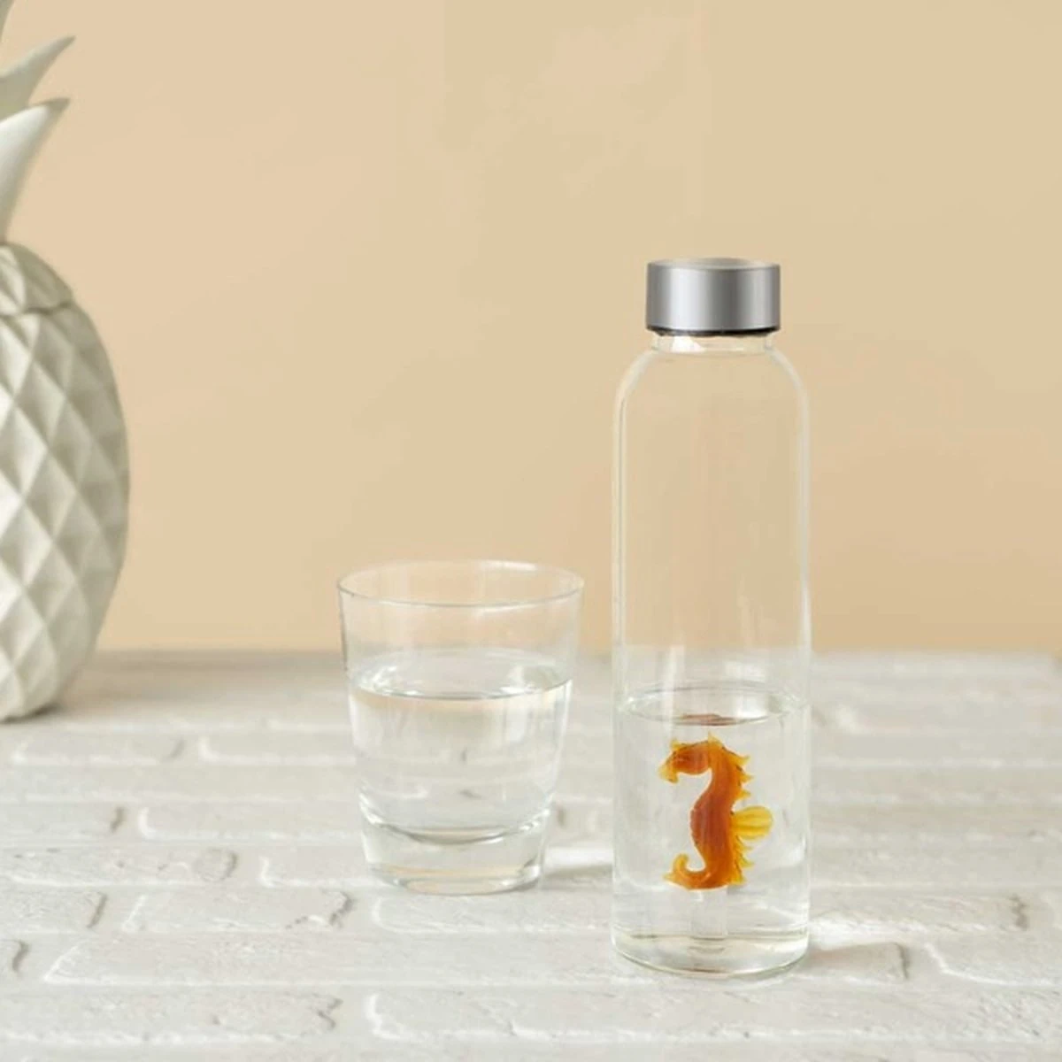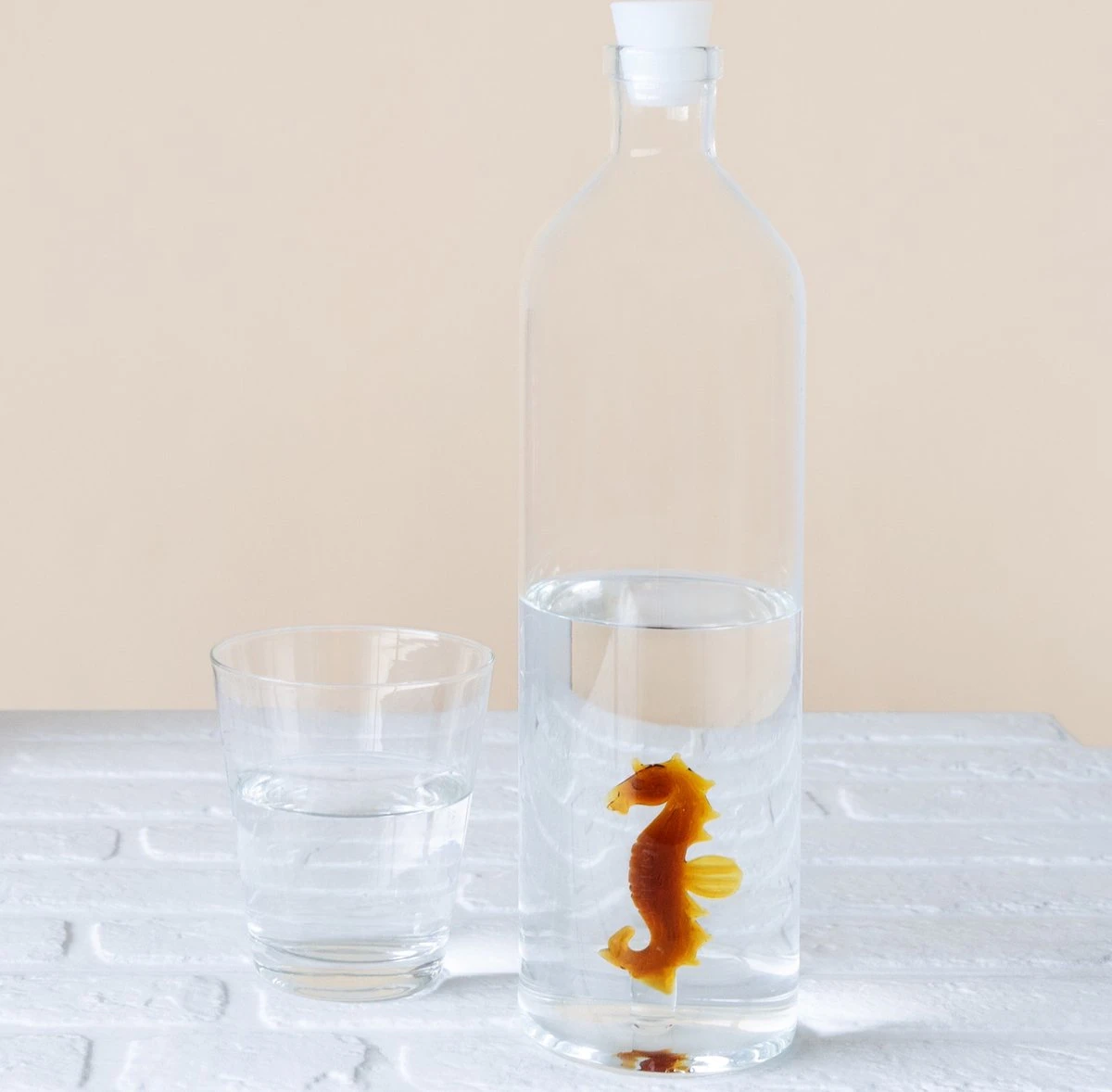 Waterfles van Balvi. Glazen fles om te vullen met water. Fles om water te bewaren in de koelkast. Waterfles met figuur op de bodem van de fles, handig om op tafel te zetten tijdens een etentje. Af te sluiten met de siliconen dop. De Balvi Bottle heeft een inhoud van 1,2 liter. Leverbaar in verschillende varianten. Afmeting: 30 x 8,5 x 8,5 centimeter.