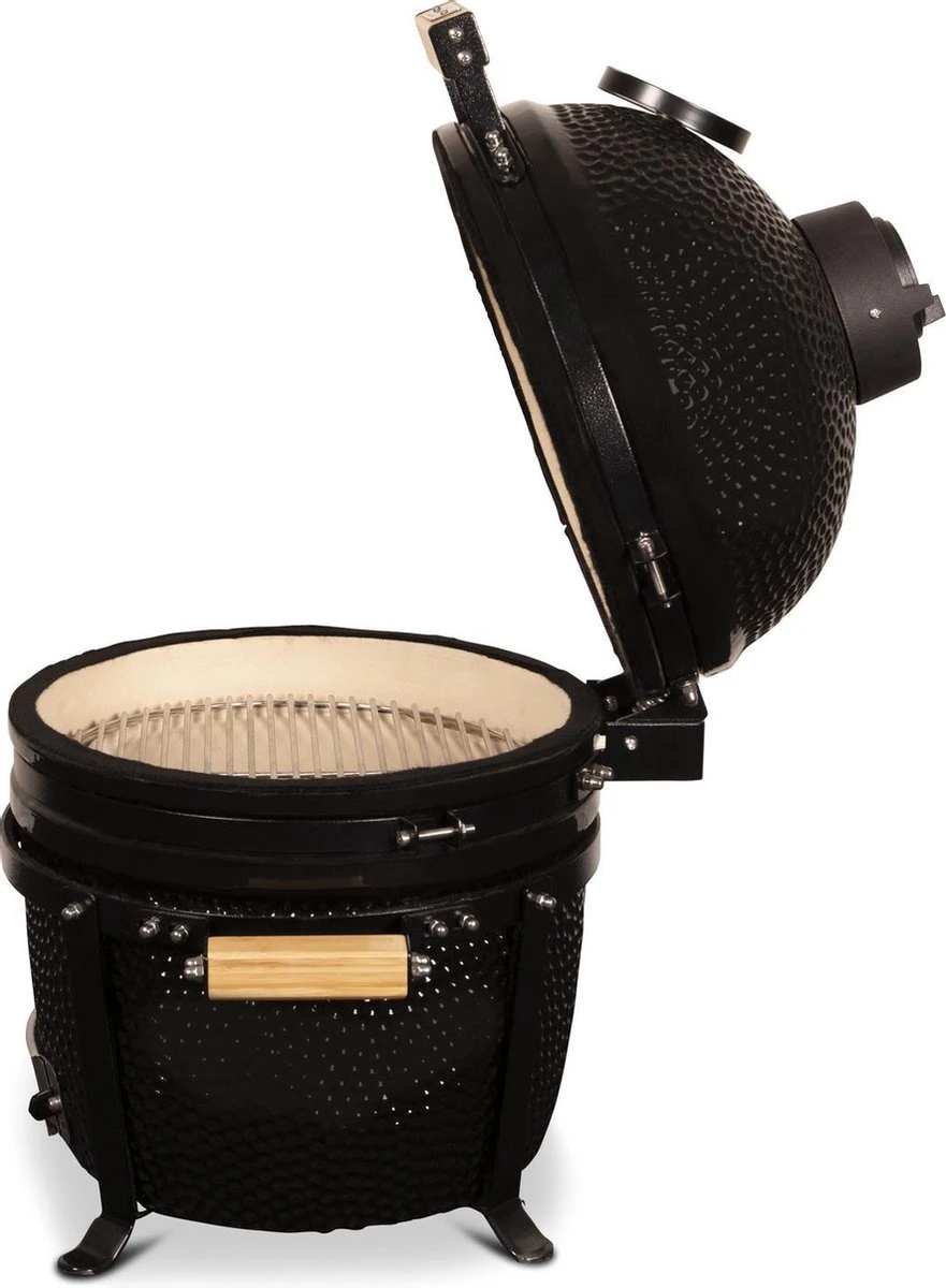 Naast aflezen, is de temperatuur ook eenvoudig te controleren en te regelen door de combinatie van het ventilatierooster aan de onderzijde met de magrietschijf/top vent aan de bovenzijde. Ook aan het grillrooster is gedacht, deze heeft een scharnierend deel zodat je makkelijk houtskool kunt toevoegen. De Premium Kamado is gemaakt van hoogwaardig, geglazuurd industrieel keramiek, dit is bestand voor temperaturen tot zo’n 1000 graden Celsius.